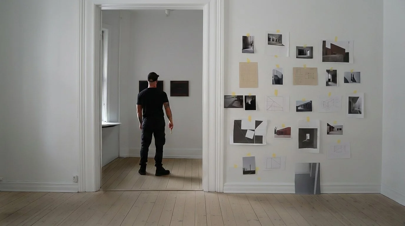 On these walks in nature, Beck takes photographs which form the inspiration for his works on canvas. This move from photograph to painting is a process of reduction; he draws from the visual material of his surroundings—such as the dense browns of earth or the clear blues of Nordic skies—but removes narrative and descriptive detail. What remains is a condensed, abstracted field he describes as a “distilled terrain.” Departing from the monochromatic restraint of his earlier exhibitions at RHODES, these new works introduce colour as a key architectural element. Here, colour operates as mass: weighted, spatial, and central to the construction of form. The distillation of nature into abstract shapes demonstrates the basis of his work in function rather than ornamentation, in a style that feels distinctly mid-century modern.